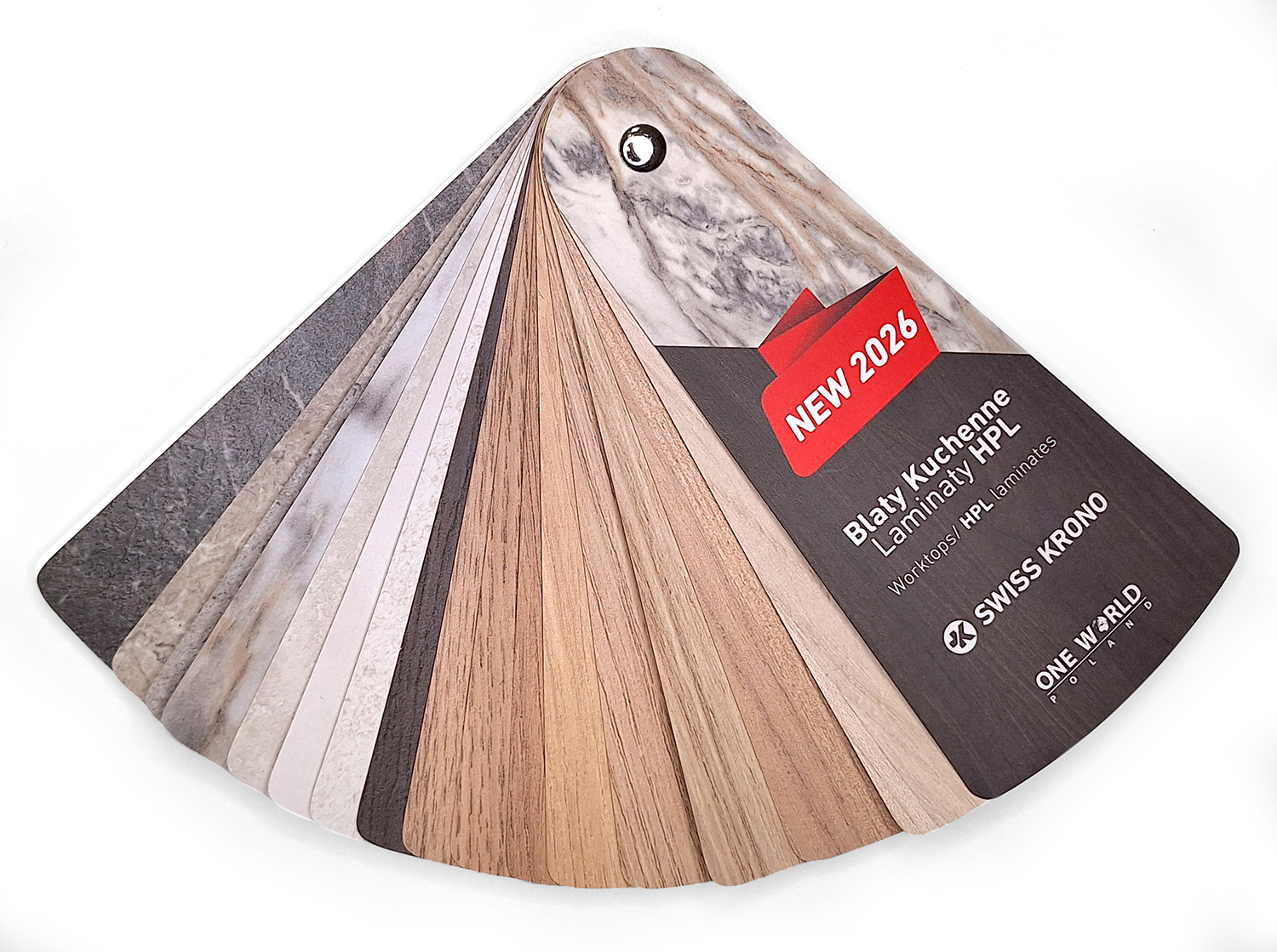 We wzorniku znajduje się wachlarz próbek HPL, 16 dekorów blaty kuchenne, wprowadzonych do sprzedaży luty 2026.